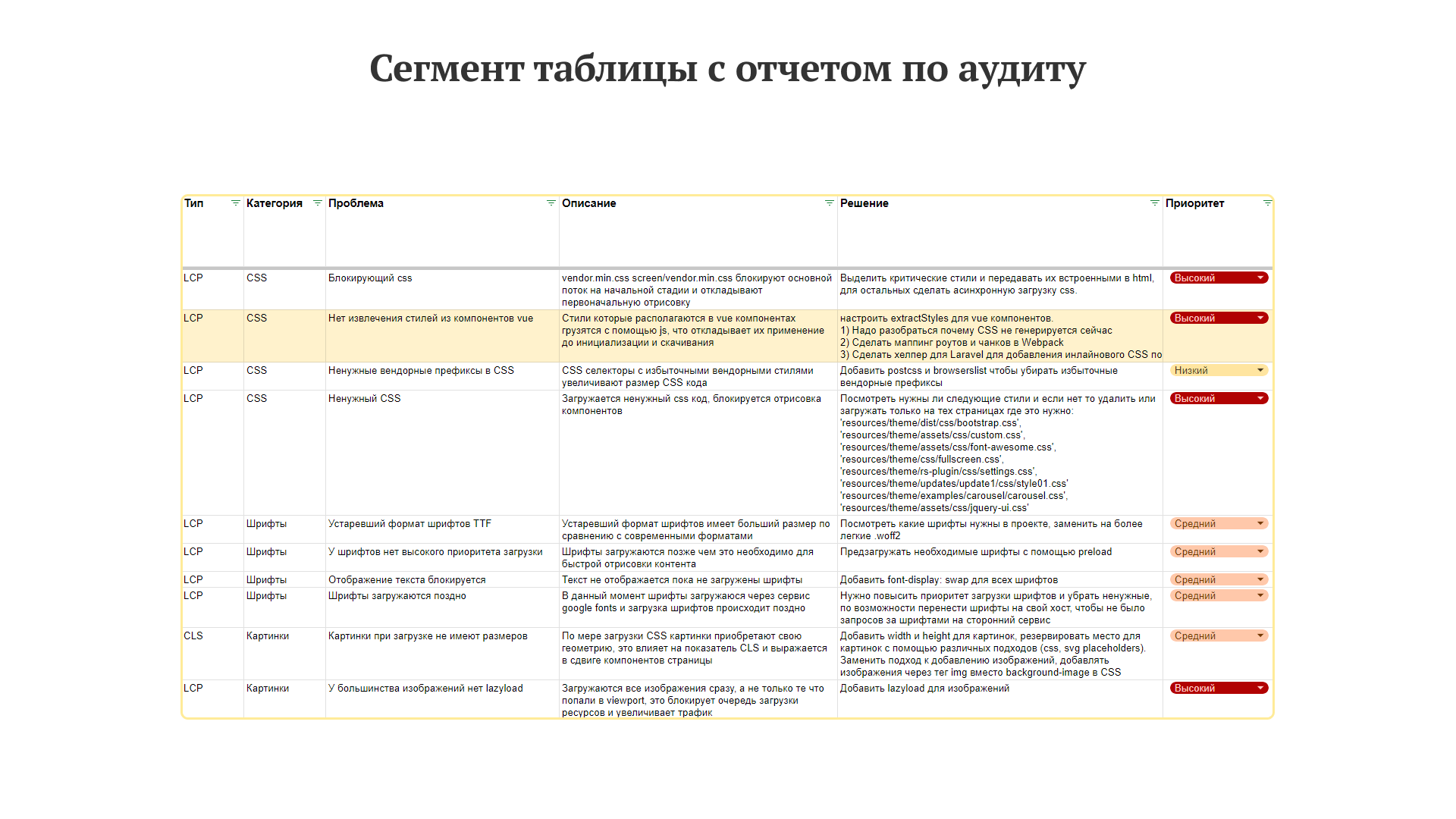 Когда все аналитические задачи были выполнены, мы составили таблицу с выявленными проблемами и способами их решения с указанием часов работы для этого. В этом, на наш взгляд, отличие качественного технического аудита: важно не просто обозначить проблемы, но и выяснить их природу, для того, чтобы предложить понятный способ решения. Еще один важный момент: приоритетность фиксации неполадок: низкая, средняя и высокая – в таблице мы указали, какие проблемы решить нужно прежде всего, чтобы получить улучшение производительности ресурса заказчика.