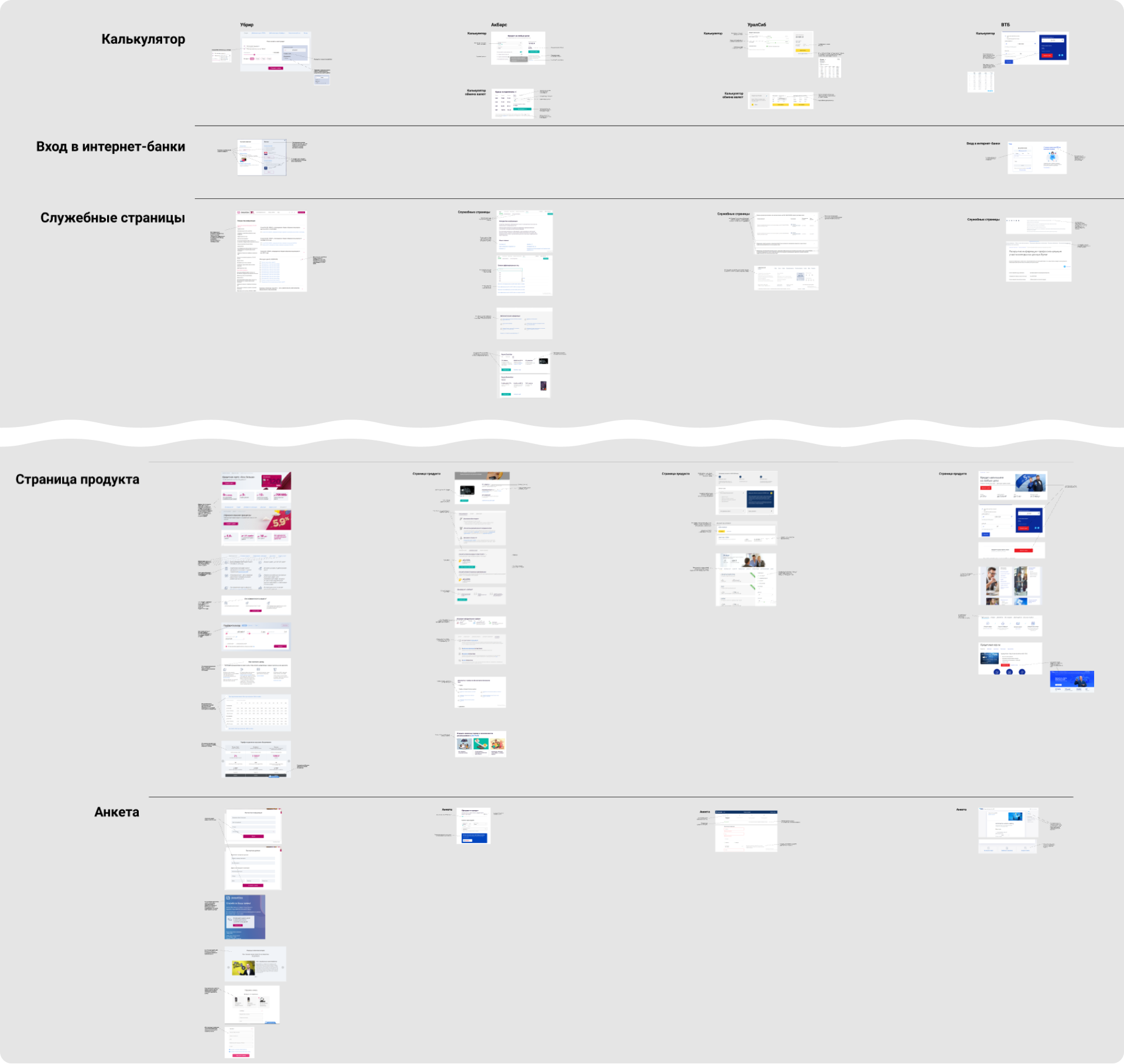 Затем мы провели анализ конкурентов. Смотрели в первую очередь на ту функциональность, которая была актуальна для нашего заказчика — это кредитные калькуляторы, каталоги банковских продуктов, контентные страницы и т.д.