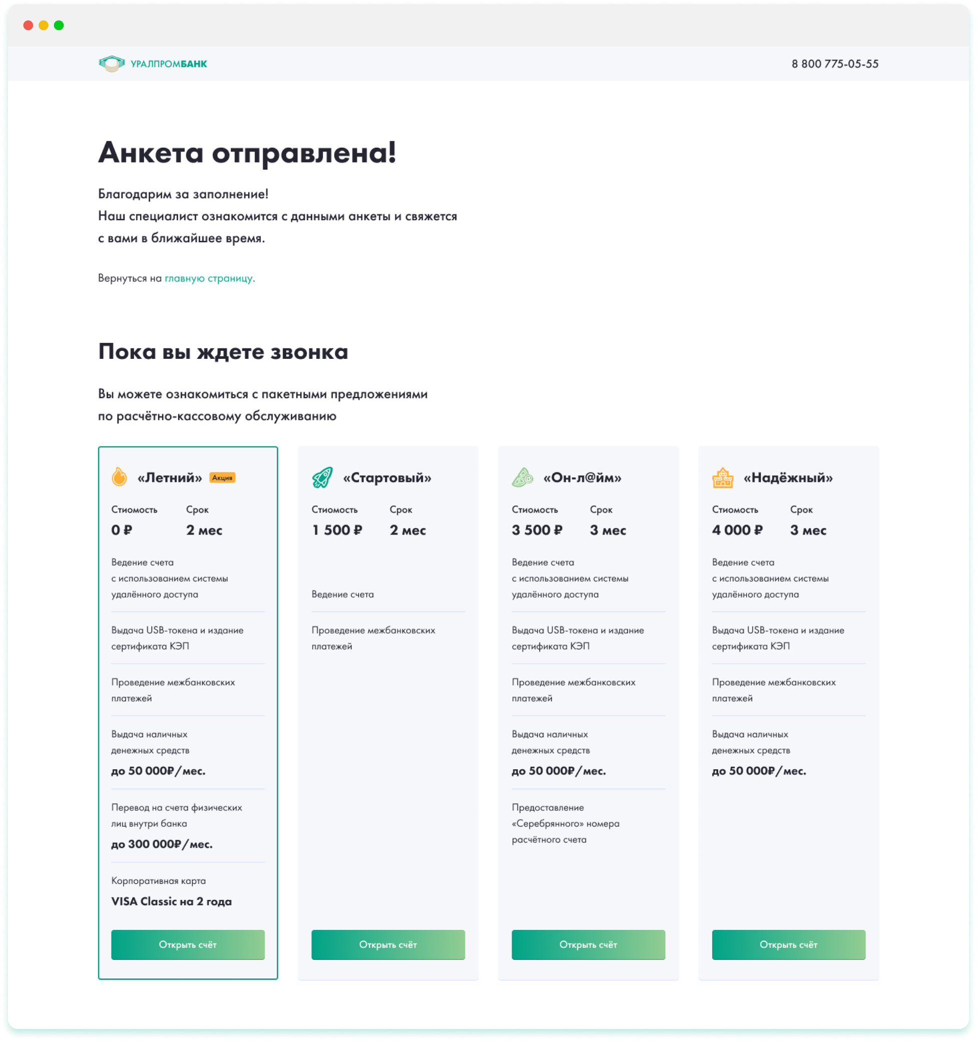 После заполнения и отправки анкеты клиент попадает на страницу благодарности. На ней есть подтверждение удачной отправки заявки и блок потенциально-полезных предложений и продуктов.