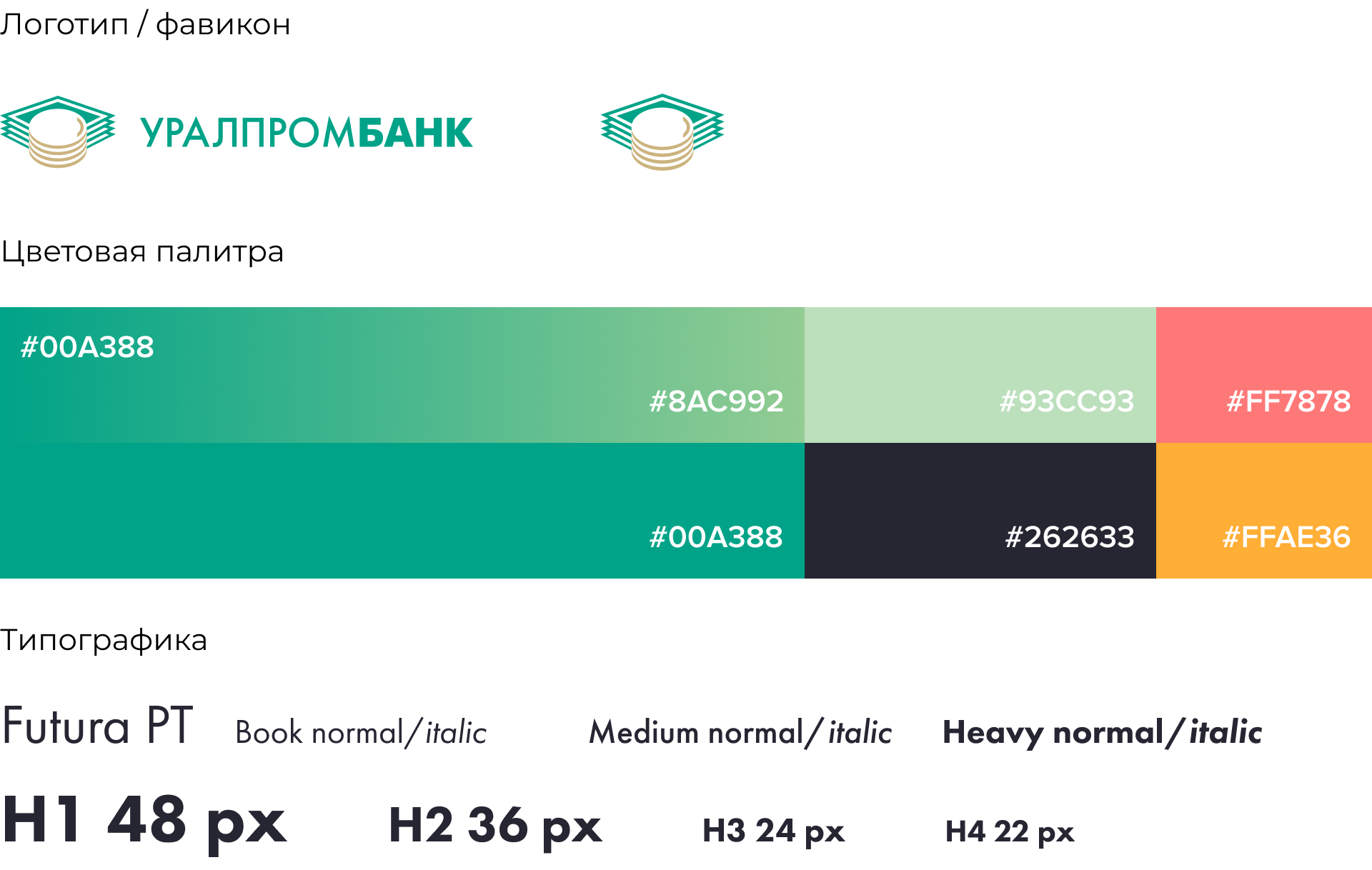 Мы изучили брендбук «Уралпромбанка» (на тот момент он состоял только из лого и цветовой палитры) и приступили к формированию общего визуального решения.