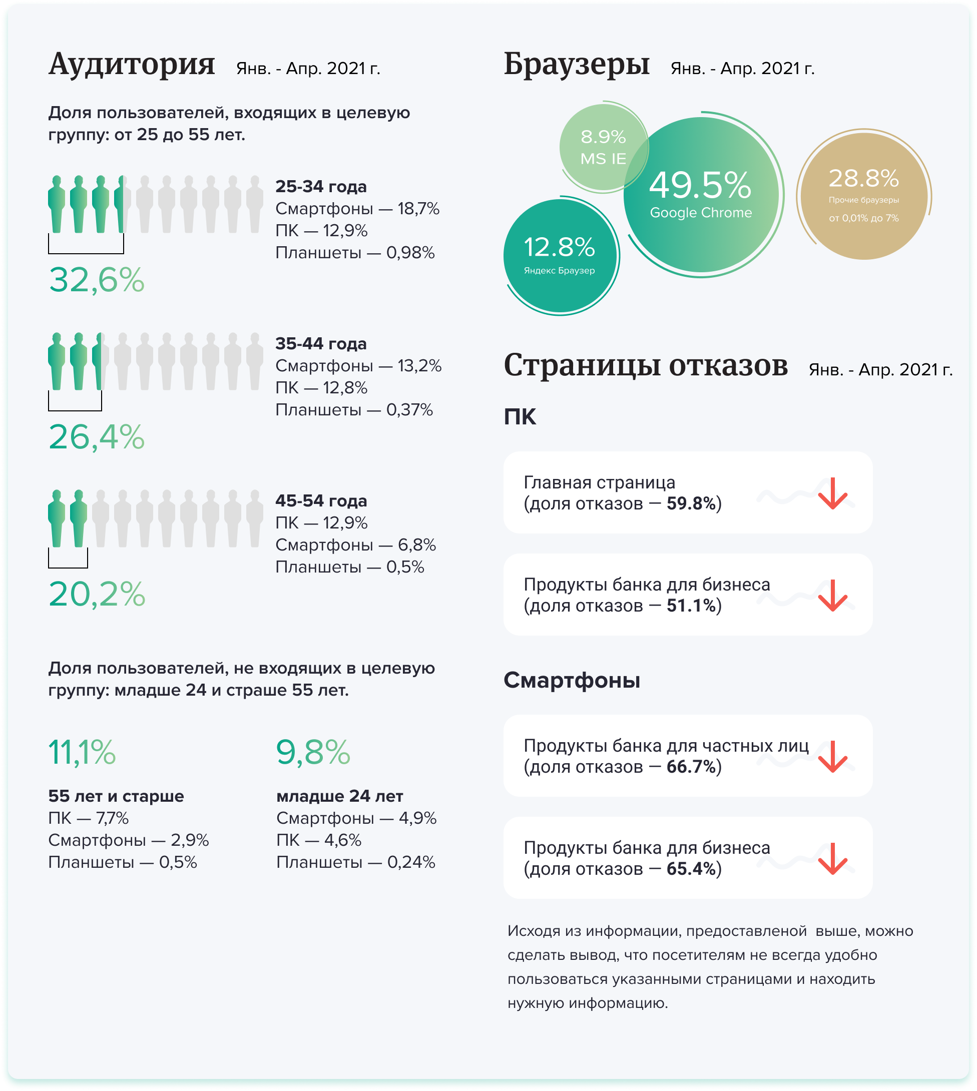 Сперва клиент рассказал нам все о своей целевой аудитории: её средний возраст, географические характеристики, какие устройства они используют чаще всего для входа на сайт и какими продуктами и услугами интересуются